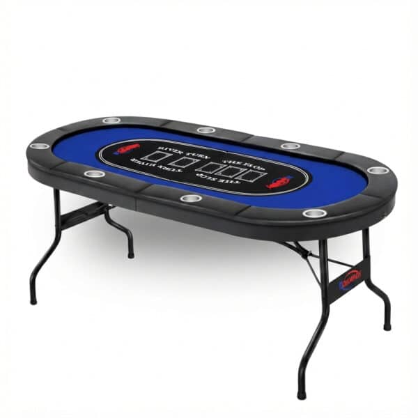 שולחן פוקר מקצועי, רחב ונוח, עם מקום ל־8 שחקנים, מחזיקי כוסות אישיים, משטח משחק איכותי ואחסון קל לאחר המשחק.